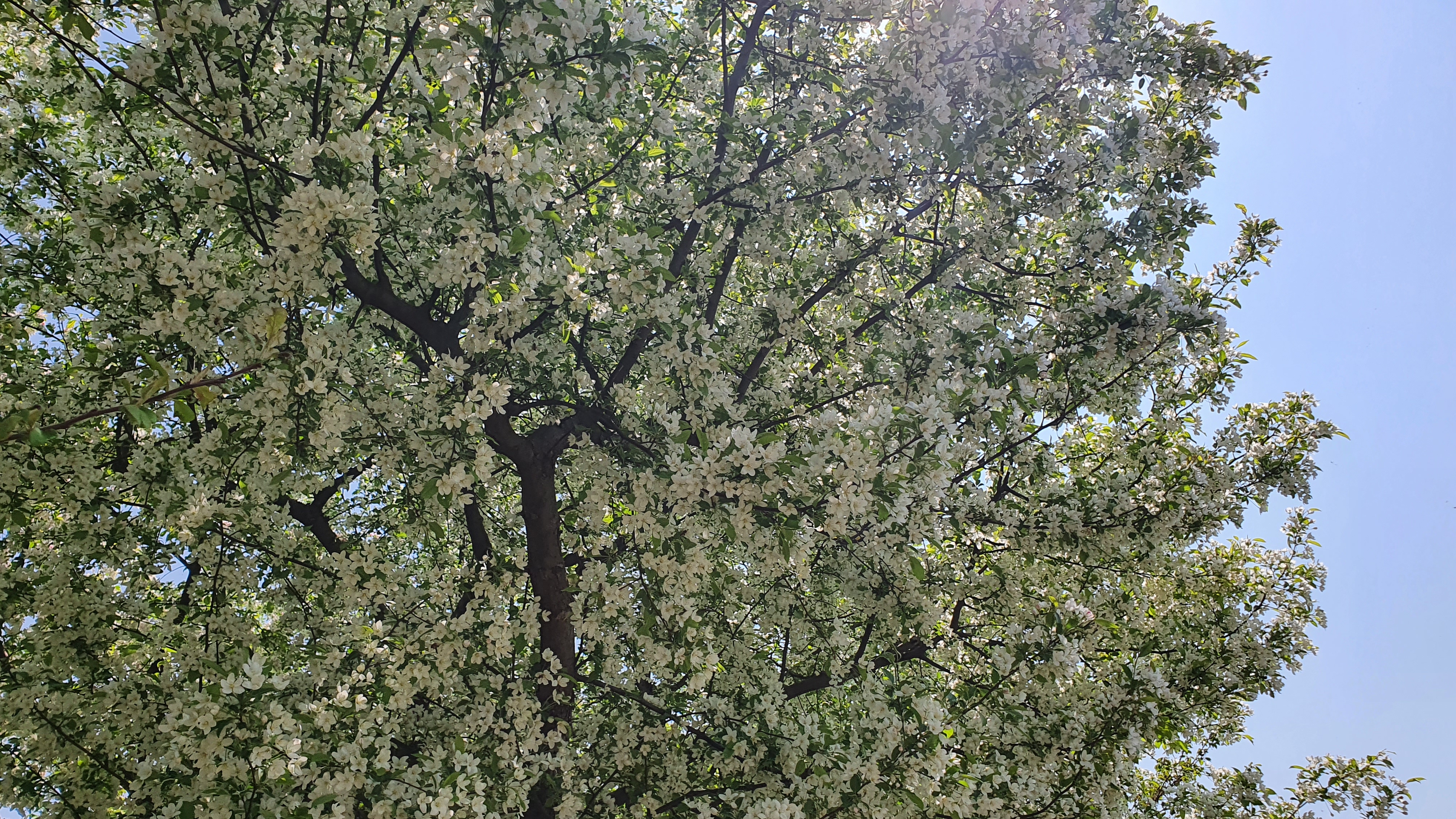 하얀 꽃이 휘감은 나무 그늘 아래로 숨어들었다가