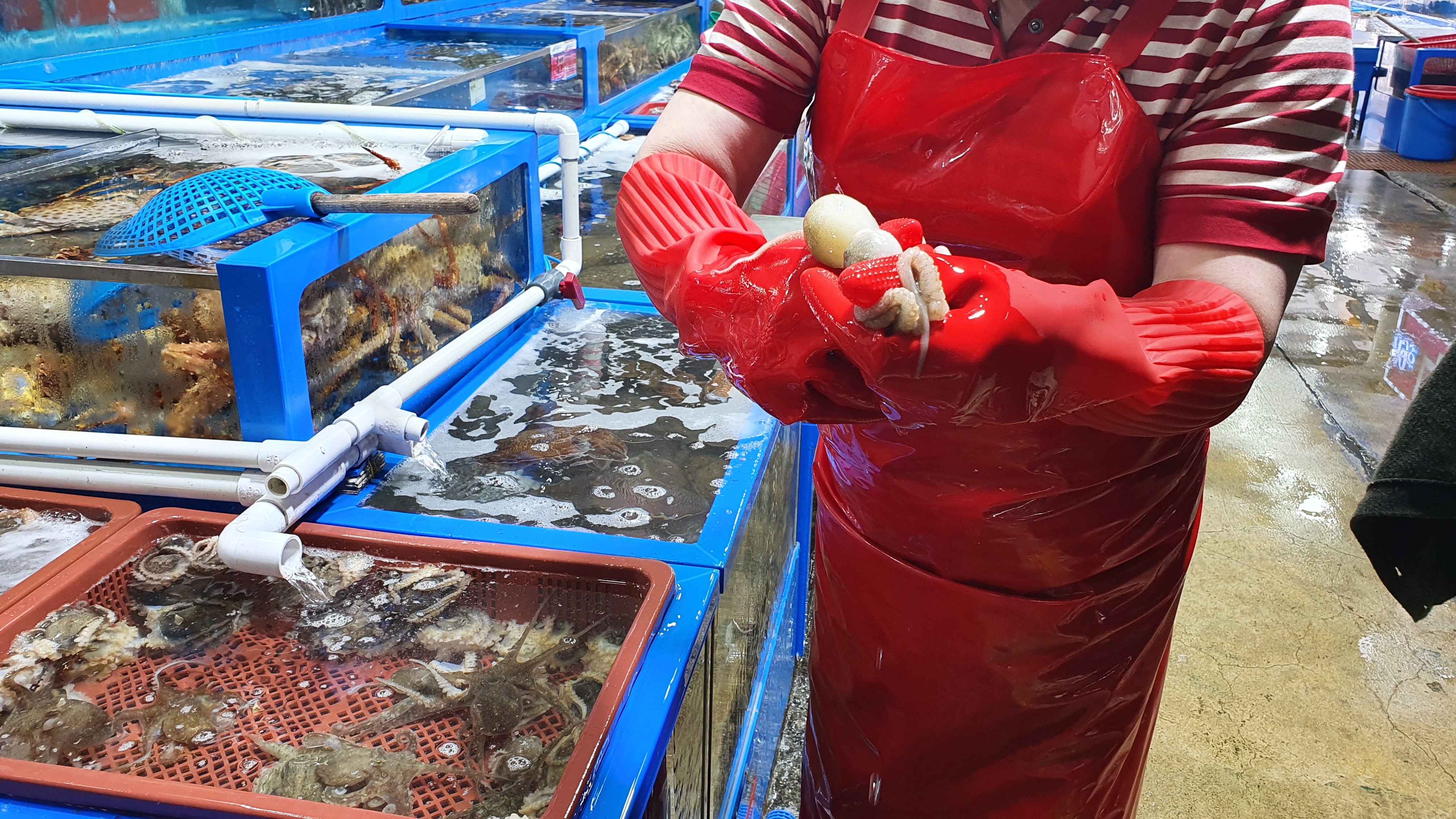 이곳 상점에서는 갑오징어 사고, 멍게 사고, 해삼 사고..