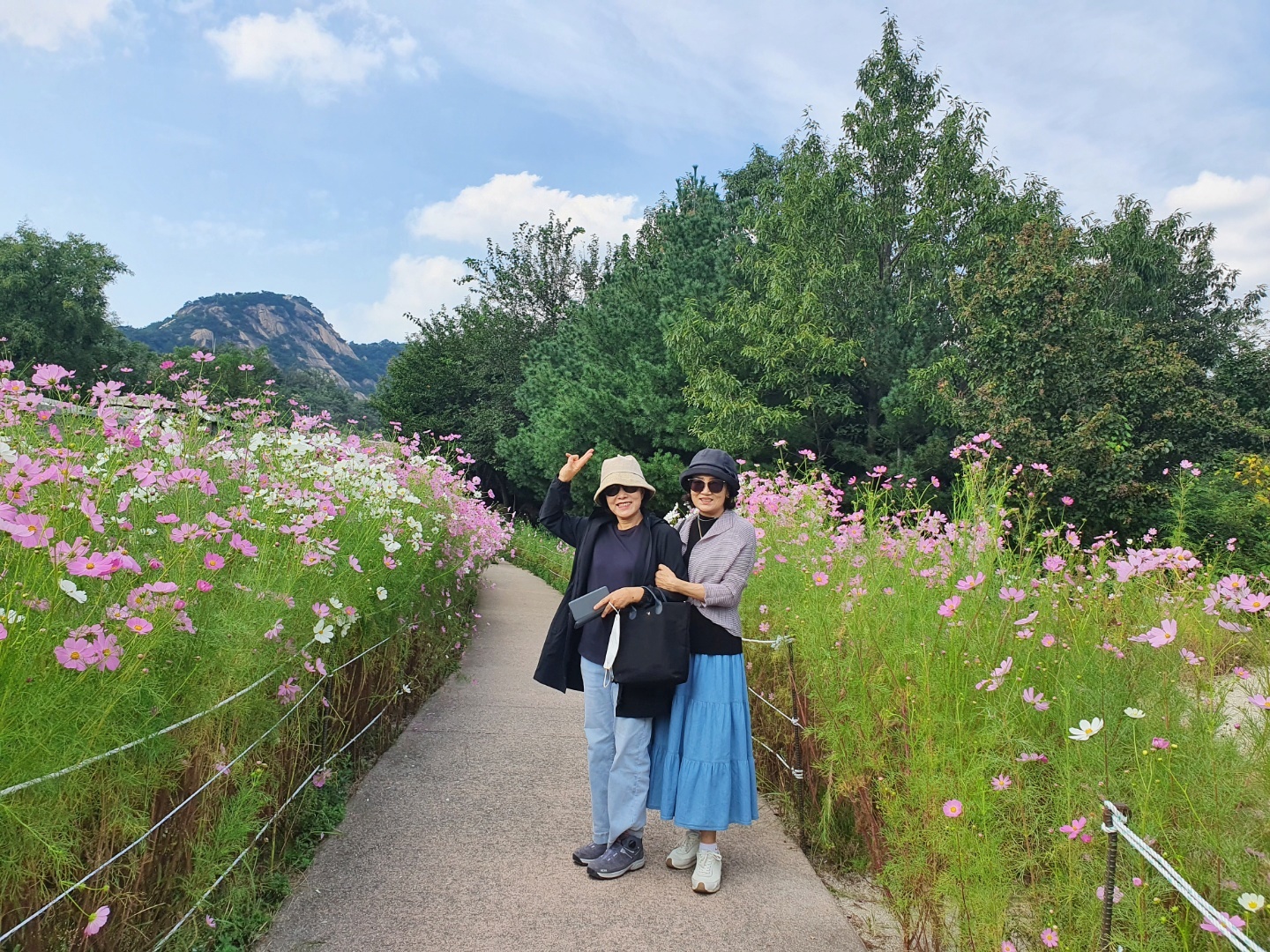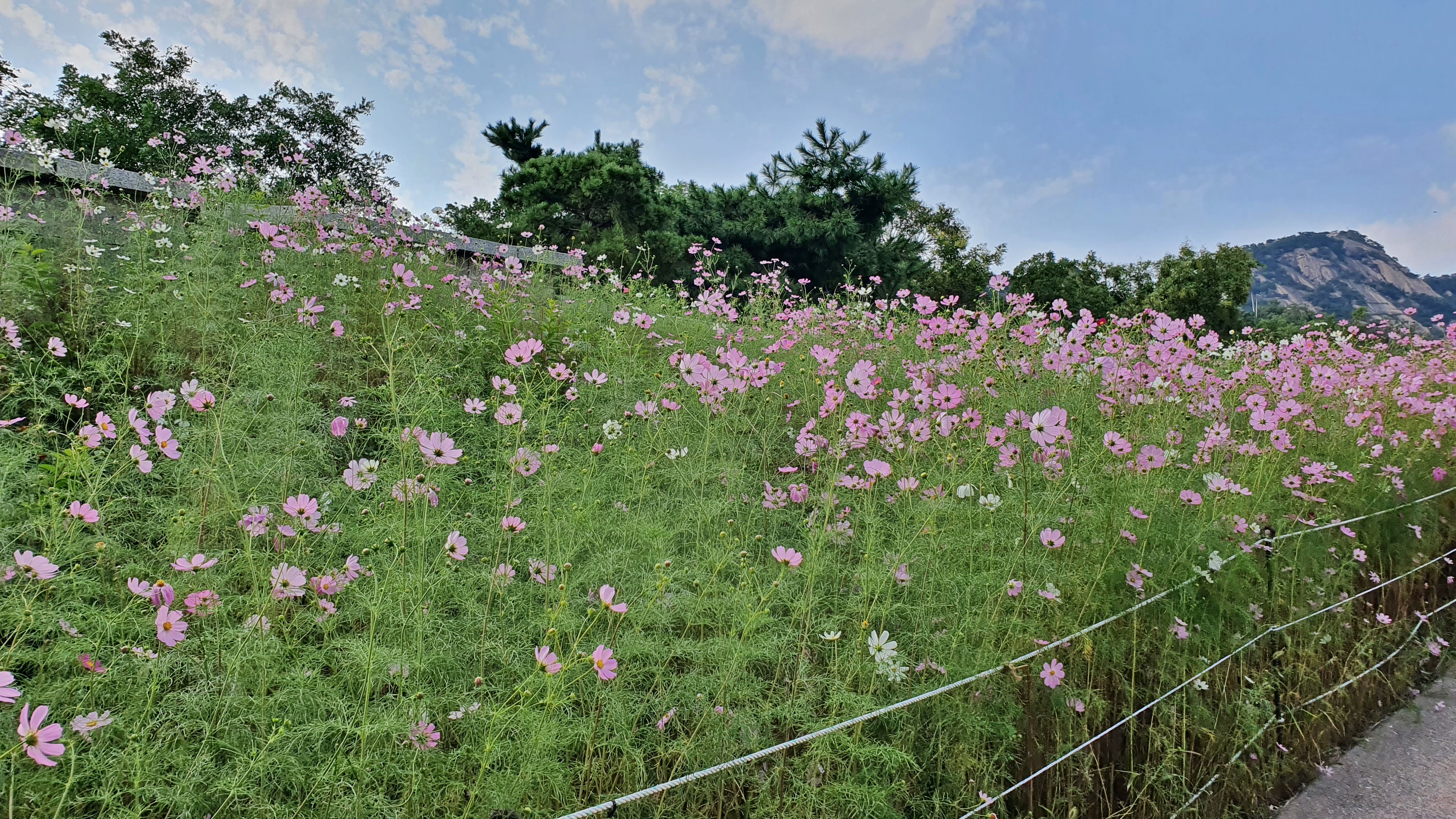 성벽 아래로 흐드러지게 피어있는 코스모스 꽃밭!