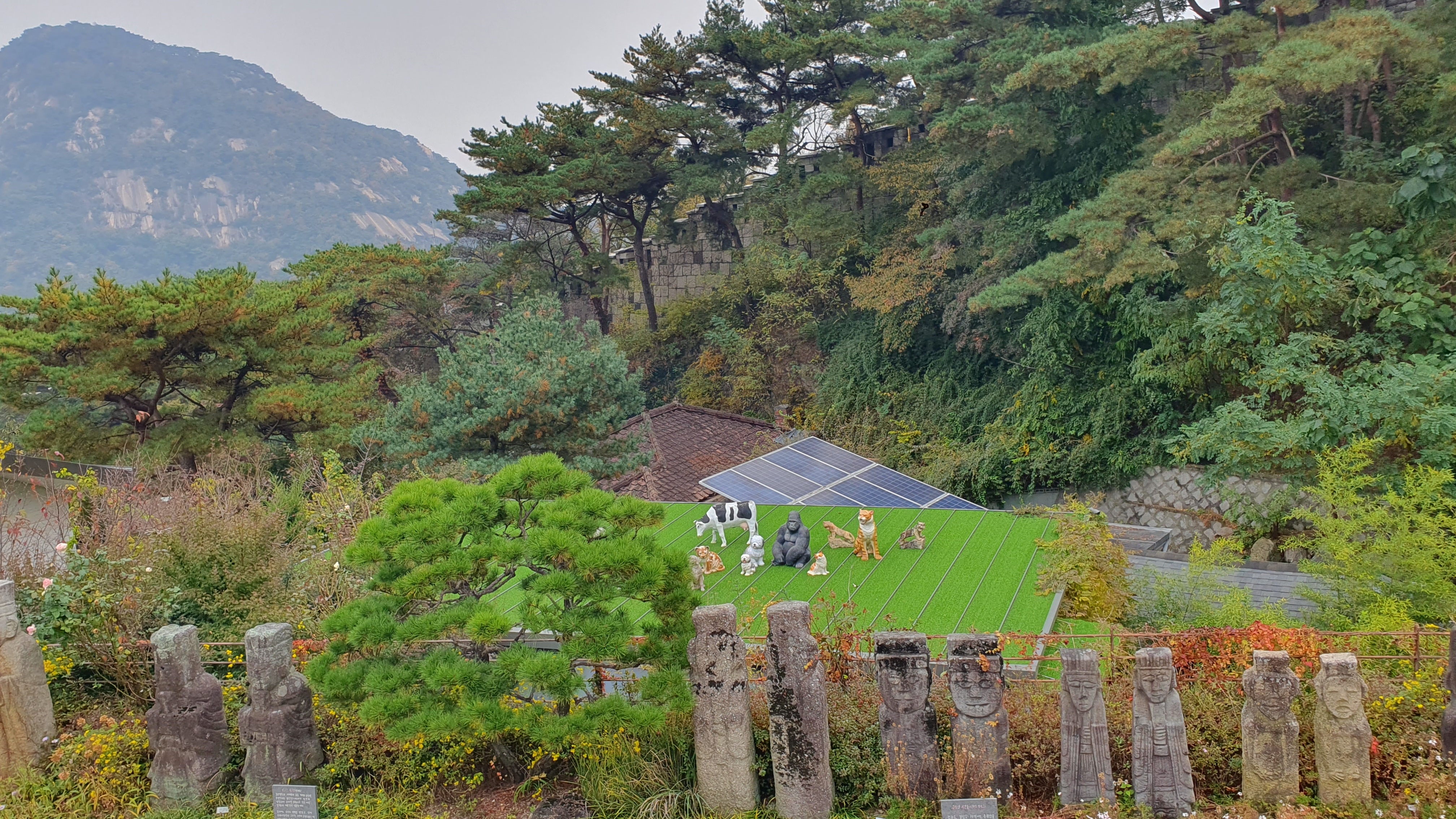 지붕 위에 올라가 있는 동물 조각상들도