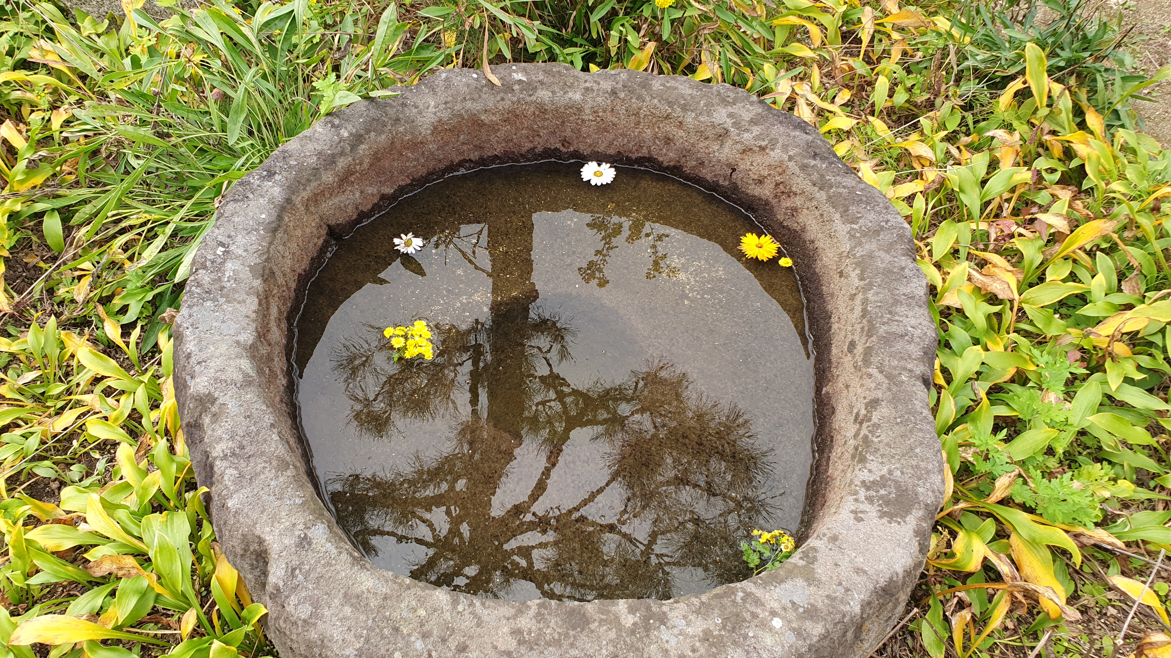 소나무를 품은 돌확에 가을 꽃잎 동동 뜨니